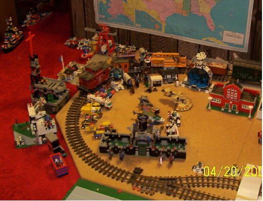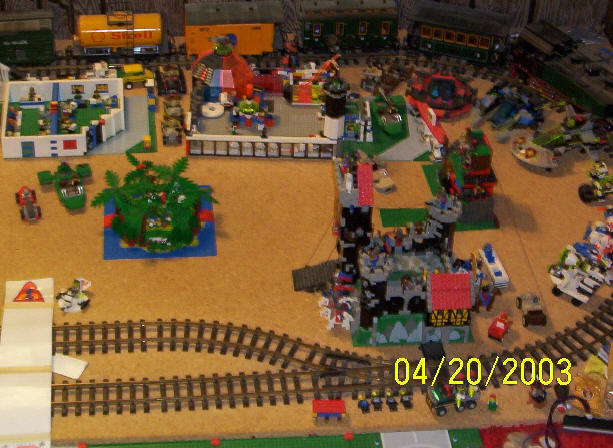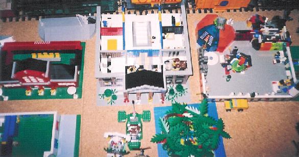 20 April, 2003. Buildings on the northern portion portion of the air force base. (You can just see the edge of the runway in the bottom of the photograph.) In the right foreground and working counterclockwise: Coland Palace, the Tea House, the National Defense Office, the Irregular Pentagon, and Coland Gardens (which were just completed the day before). 20 April, 2003. Here is southern Coland, seen from above. The Parliament building is in the center of the picture. The red building on the right (which sits just to the left of the Irregular Pentagon) houses the Supreme Court. Continuing to the left, you will see the Infirmary, the Viceroyalty of Corey Sheriff's Office, the Viceroyalty Militia Colonel and personnel wagon, the transporter room, and support vehicles. The Coland Police Second Precinct is located behind the Parliament building. On the far left is downtown Coland and Coland Harbor. 30 December 2001. This photograph from the river shows the Police out in force to provide security for the Parliament meeting. As is often the case, dignitaries from Octan were present, and their aircraft can be seen parked on the tarmac to the right of the runway. 30 December 2001. An aerial photograph reveals full Houses of Parliament and the police lines. 2004, late January. One of the few aerial photographs of the entire air force base. The big news at this time was the completion of the Executive Office Building, nestled in between the Supreme Court to its left and the National Defense Office to the right. You will recognize most of the other buildings from the captions of the photographs at the top of the page (from April 2003). You can also see that the Irregular Pentagon has been moved from its previous position (the position now occupied by the EOB) by Dikanian engineers using graviton-cable cranes and plopped in the middle of the street. This feat of engineering allowed the IP to be fully functioning right up to the commissioning of the EOB and then to be saved for recycling. You have likely noticed that the first half of 2004 was a cluttered time in Coland, as the engineers had not yet gotten around to another badly-needed feat of engineering known as 'paving an off-site parking lot.' [For a history of the Executive Office Building and the Irregular Pentagon, see the bottom part of this page.] 2004, late January. An unusual overhead photograph of the just-finished EOB construction site reveals its interior and that of some neighboring buildings. The right side of the Irregular Pentagon is nearly bare; the Cabinet secretaries having moved out and taken their office furniture into the EOB. coland main page · home · historic image archive