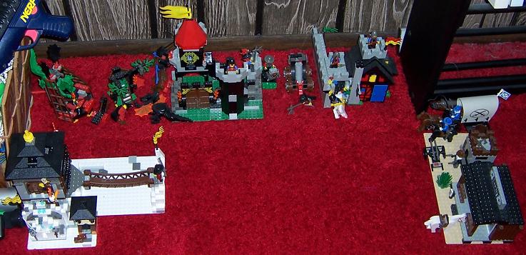 A panorama of Fayette Springs: (from left to right) Althan Rock (the Emperor's personal depository), Viceroy Aslan's residence, the Three Bread Inn, and the Viceroyalty of Corey Sheriff's Office. This aerial view of Fayette Springs reveals Governor R's house to the left of Aslan's residence and several of the people who make Fayette Springs their home: an encampment of Fright Knights in the top left corner, Siege Battery A of the Army's Medieval Division to the left of the inn, and the Viceroyalty Militia unit (in blue uniforms) next to the Sheriff's office.