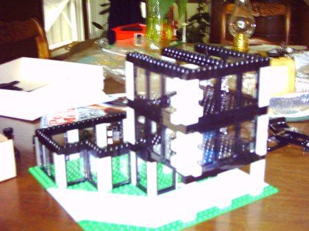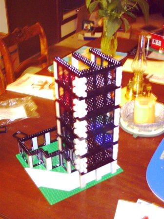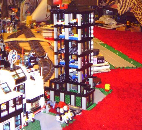 Here the tower is almost complete, with only the roof, elevator, and internal furnishings missing. Now the tower is in place in downtown Coland, and the tenants are moved in. In this picture, however, the lobby had not been furnished. Another angle and a finished lobby with fountain, bar, and post office. The lobby as viewed from the atrium's rafters. A sidewalk-level view of the building. The covered driveway and main entrance (under the tower) is very popular on rainy days.