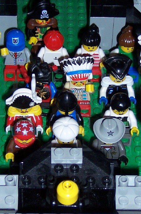 House of Ministers:  Bald man at rostrum:  Prime Minister Hawk; Row One:  Trans Atlantic, Chef, Sheriff Westwood; Row Two:  Governor Fort, Colonel Catapult, Banker Gold; Row Three:  Messenger Steve, Chief Jumping Horse, Admiral Rock; Row Four:  Commander Buoy, Cargo Man, Louise Labé, Nurse Hypo; Back Row:  Rear Admiral Red Beard